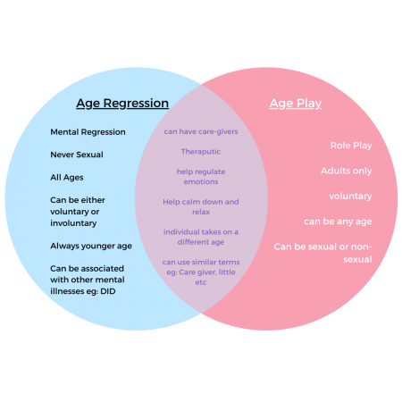 This venn diagram outlines clear distinctions and similarities between the two and why there can sometimes be confusion and use of similar terms between “SFW” age regressors and those who participate in age play: